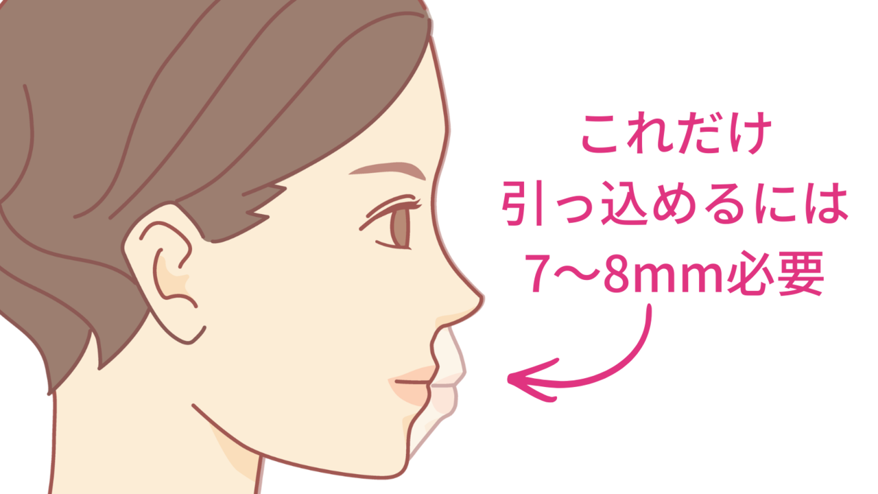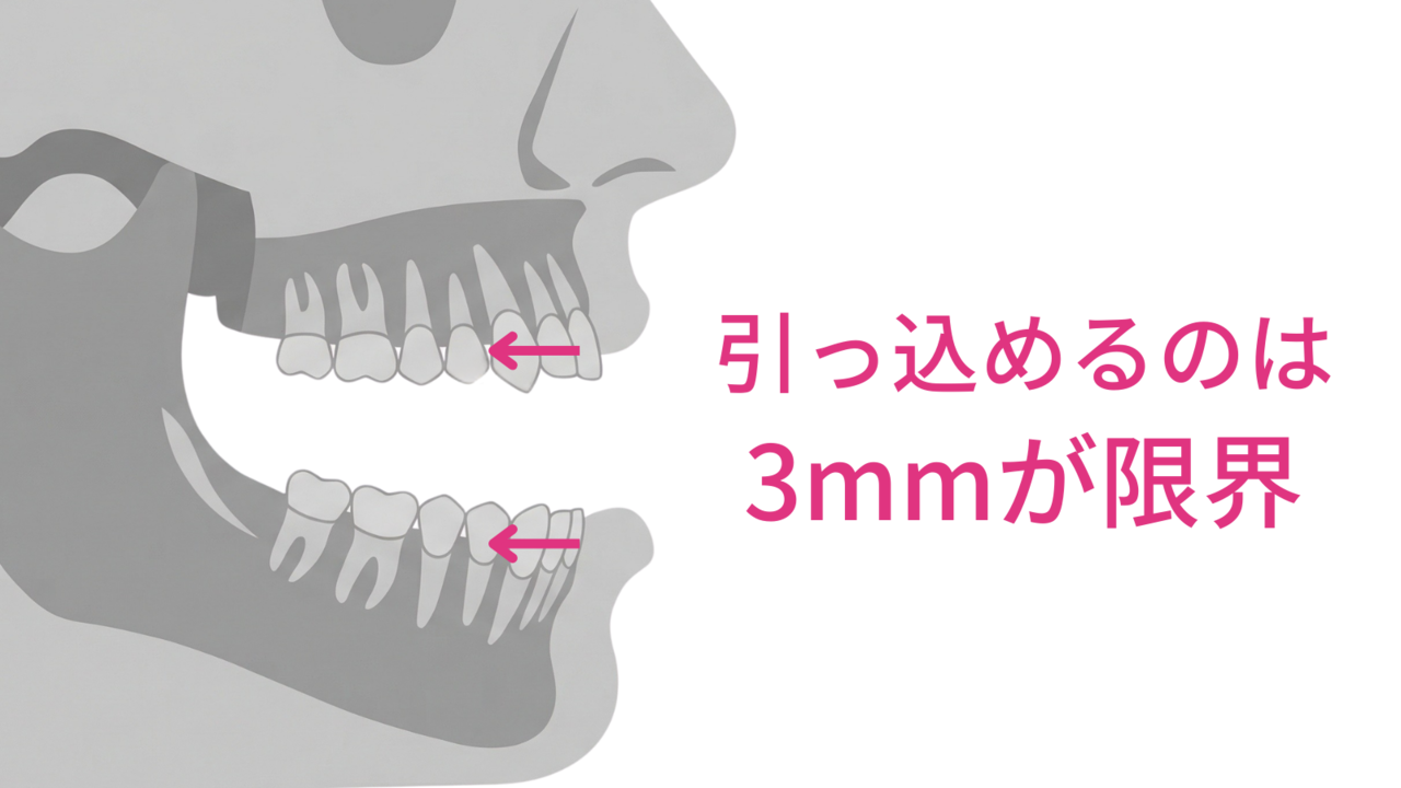 最低でも4〜5mm、重度なら7〜8mm必要なのに、3mmしか引っ込められない。結果、治療を終えても口ゴボが残ったまま。「矯正したのに変わらなかった」という失敗が起きます。