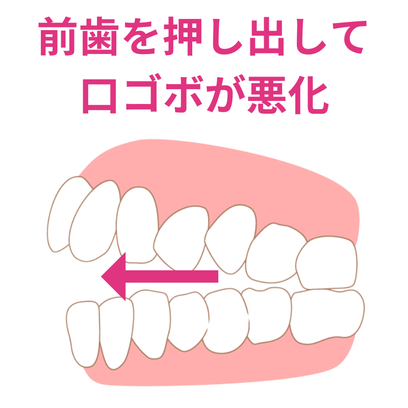 この状態を放置すると、次々と隣の歯を斜めに押し出していき、最後には前歯が押し出されて、口ゴボや出っ歯、あるいはガタガタの歯並びになってしまうのです。